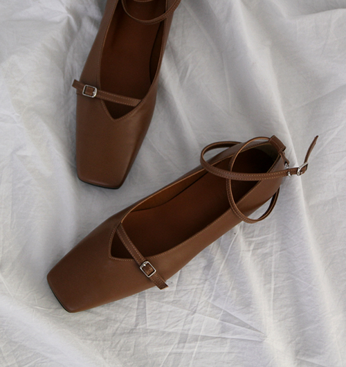 스퀘어 토우와 스트랩이 돋보이는 플랫슈즈 입니다.